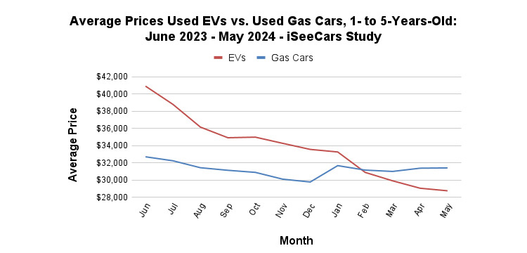 Согласно исследованию платформы по продаже подержанных машин iSee Cars, средняя цена электромобилей на вторичном рынке США опустилась ниже средней цены топливных автомобилей. Перелом случился еще в феврале, а в мае разница достигла уже 8,5%. После анализа 2,2 млн предложений выяснилось, что «электрички» стоят в среднем 28757 долларов против 31424 долларов за автомобиль с ДВС. Еще год назад, в июне 2023-го, электромобили стоили на 25,1% дороже.