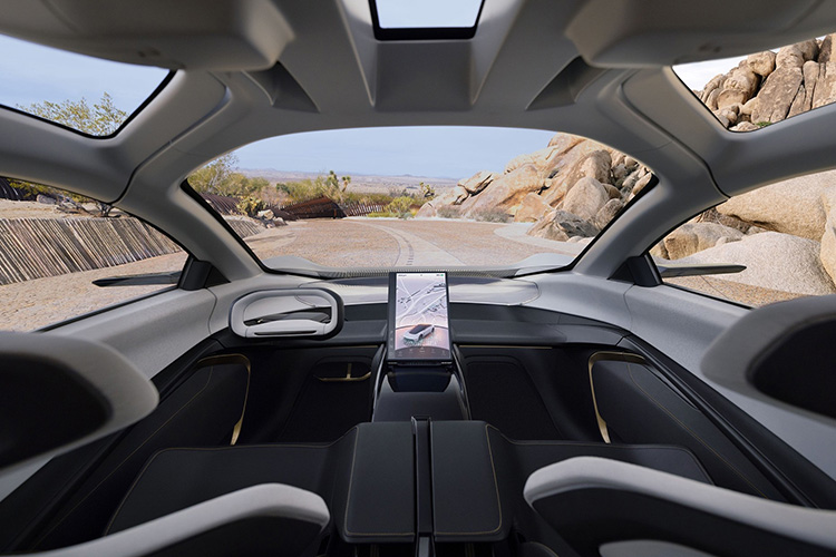 Боковые зеркала заменены камерами заднего вида, а задние двери открываются против хода. Вдобавок у концепта подъемные панели крыши, облегчающие посадку в салон. Лаконичная корма наделена активными спойлером и диффузором. Колеса обуты в шины Pirelli размерности 255/35 R22.