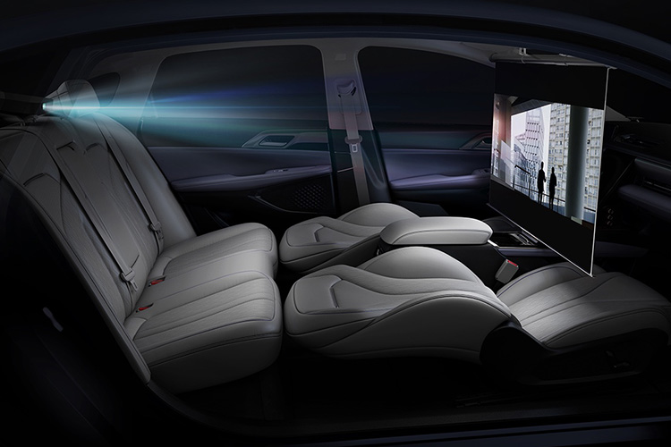 Салон отделан кожей Nappa. Цифровая приборка насчитывает 12,3 дюйма, вертикальный тачскрин — 15,6 (1920×1080 точек). Заваленные спинки передних сидений образуют подобие кровати для «режимов сна и кинотеатра»: с потолка раскладывается 47-дюймовый экран, но входит ли в оснащение проектор?