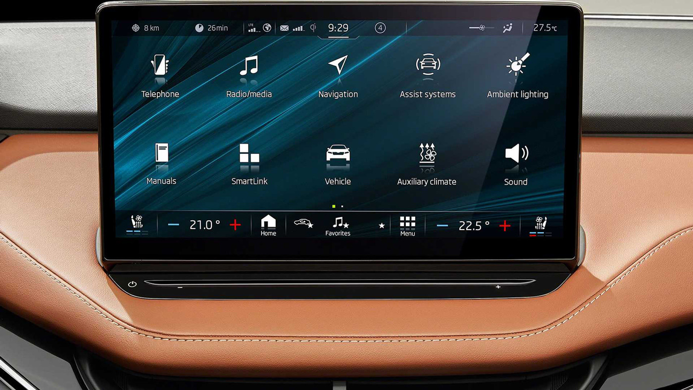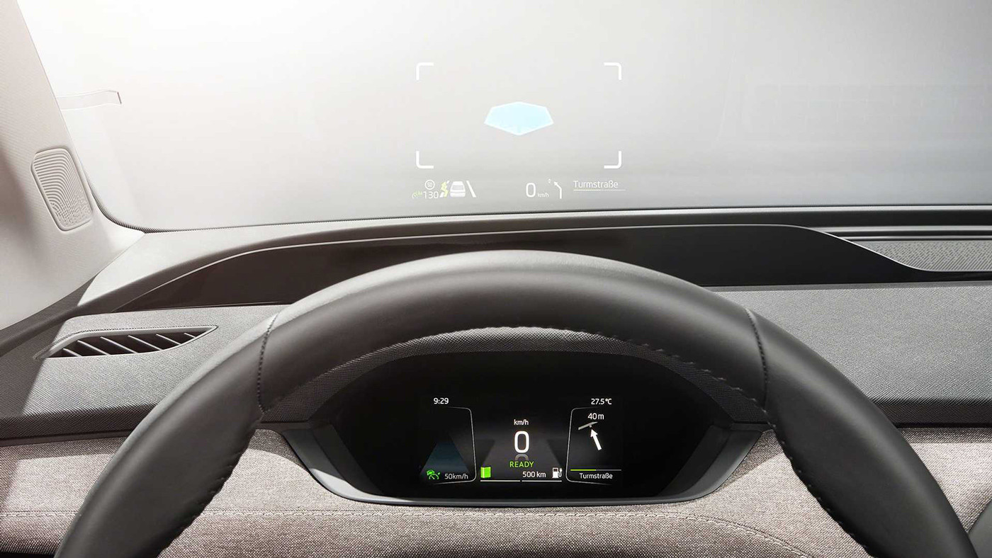 Первенец Шкоды на электрической платформе MEB, кроссовер Skoda Enyaq iV, оказался интересен не только собственно самим электроприводом. Паркетник в старших комплектациях похвастал 13-дюймовым центральным экраном (больше, чем на любой Шкоде, базовый экран — на 10) и впервые для марки получил проекционный дисплей с дополненной реальностью. Он выводит крупные подсказки навигации, а также информацию о работе помощников водителя — от автоматического удержания в полосе до адаптивного круиз-контроля.