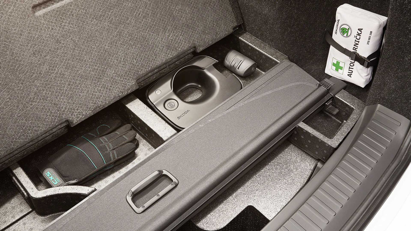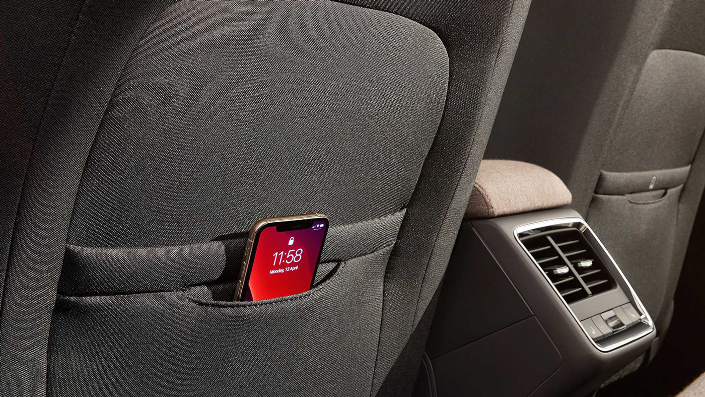 В число элементов Simply Clever включены зонтики в передних дверях и набор для сна на втором ряду, выдвижные шторки на задних боковых дверях и система очистки зарядного кабеля, электропривод пятой двери с виртуальной педалью и столики в спинках передних кресел, два порта USB-C и розетка на 230 В в задней части салона, настраиваемый по высоте фальшпол в багажнике и сетки для него же