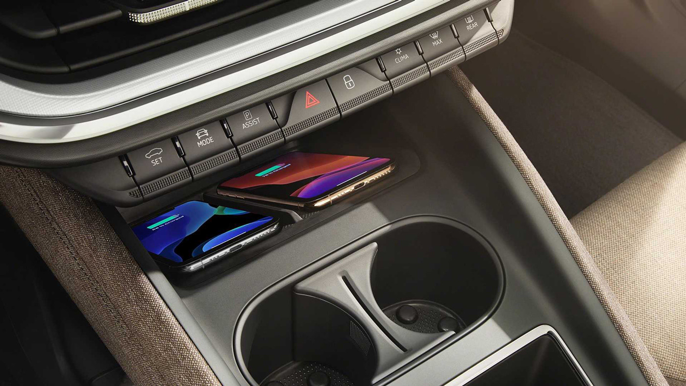 В архитектуре интерьера прослеживается влияние последних серийных машин бренда вроде хэтчбека Skoda Scala, а также концептов Vision iV и Vision E. Под центральным подлокотником бокс на 6,2 л, под центральной консолью-мостом — ещё на 11,4