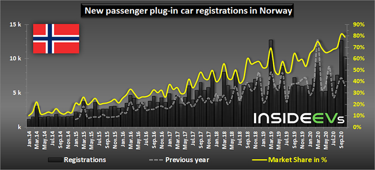 В октябре почти 80% проданных в Норвегии автомобилей были электрическими