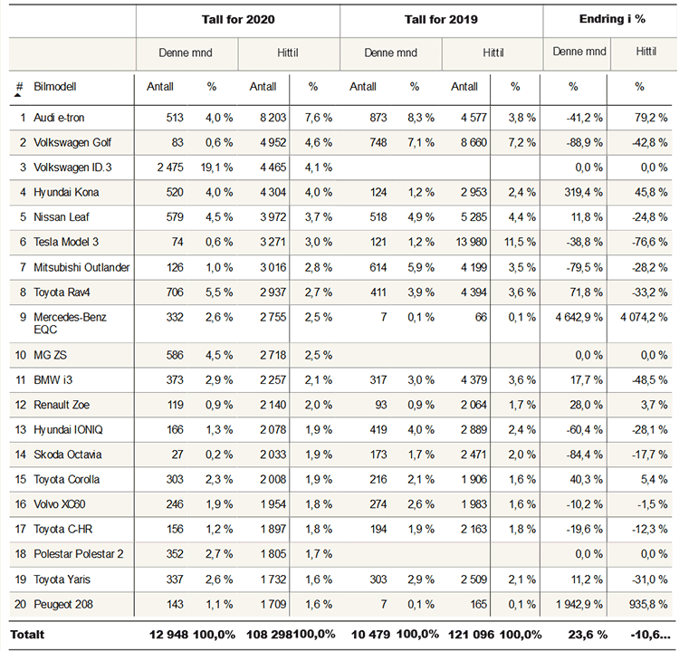 С результатом 2,475 экземпляров (19,1% рынка) новый электромобиль Volkswagen ID.3 занял первое место, при этом всего за два месяца этой модели удалось достичь результата 4,465 регистраций — это третий результат года среди всех автомобилей, проданных в Норвегии (больше только у Audi e-tron и Volkswagen e-Golf).