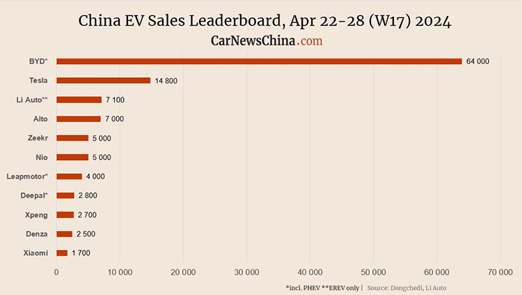 BYD, как обычно, заняла первое место, продав 64 000 единиц, что на 7,56% больше, чем 59 500 единиц на предыдущей неделе. С 1 по 28 апреля BYD продала уже 219 500 электромобилей и гибридов.